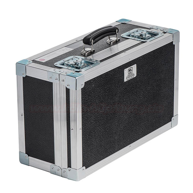 Auf dem Produktbild sieht man deutlich den hochwertigen, schwarzen Transportkoffer mit stabilen Metallschutzecken, robustem Tragegriff und sicheren Verschlüssen.