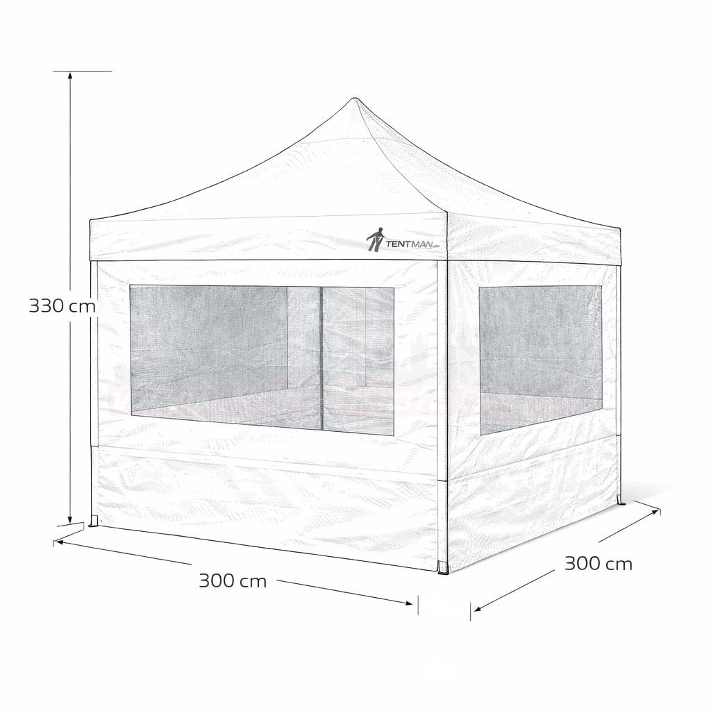 Das faltbare Zelt hat eine Grundfläche von 3 Meter mal 3 Meter. In der Höhe ist es 3-fach verstellbar zwischen 187 und 207 cm. In der obersten Stufe beträgt die Höhe in der Zeltspitze ca. 330 cm.