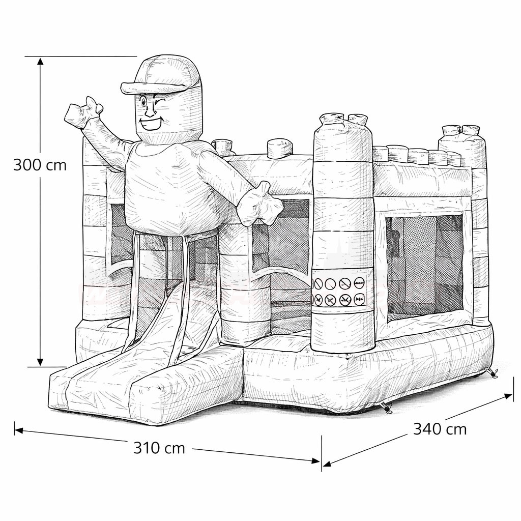 Schon auf den ersten Blick begeistert die Hüpfburg durch ihr knalliges Farbkonzept aus Rot, Gelb, Blau, Grün und Orange. Die aufgesetzte, freundlich lachende Spielfigur mit blauer Kappe erinnert an Baustein-Spielwelten und macht die Hüpfburg besonders einladend für Kinder. Genau das Richtige, um leuchtende Augen und strahlende Gesichter zu garantieren. 😊