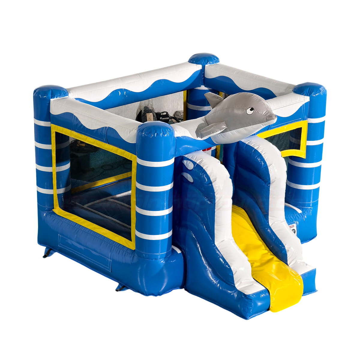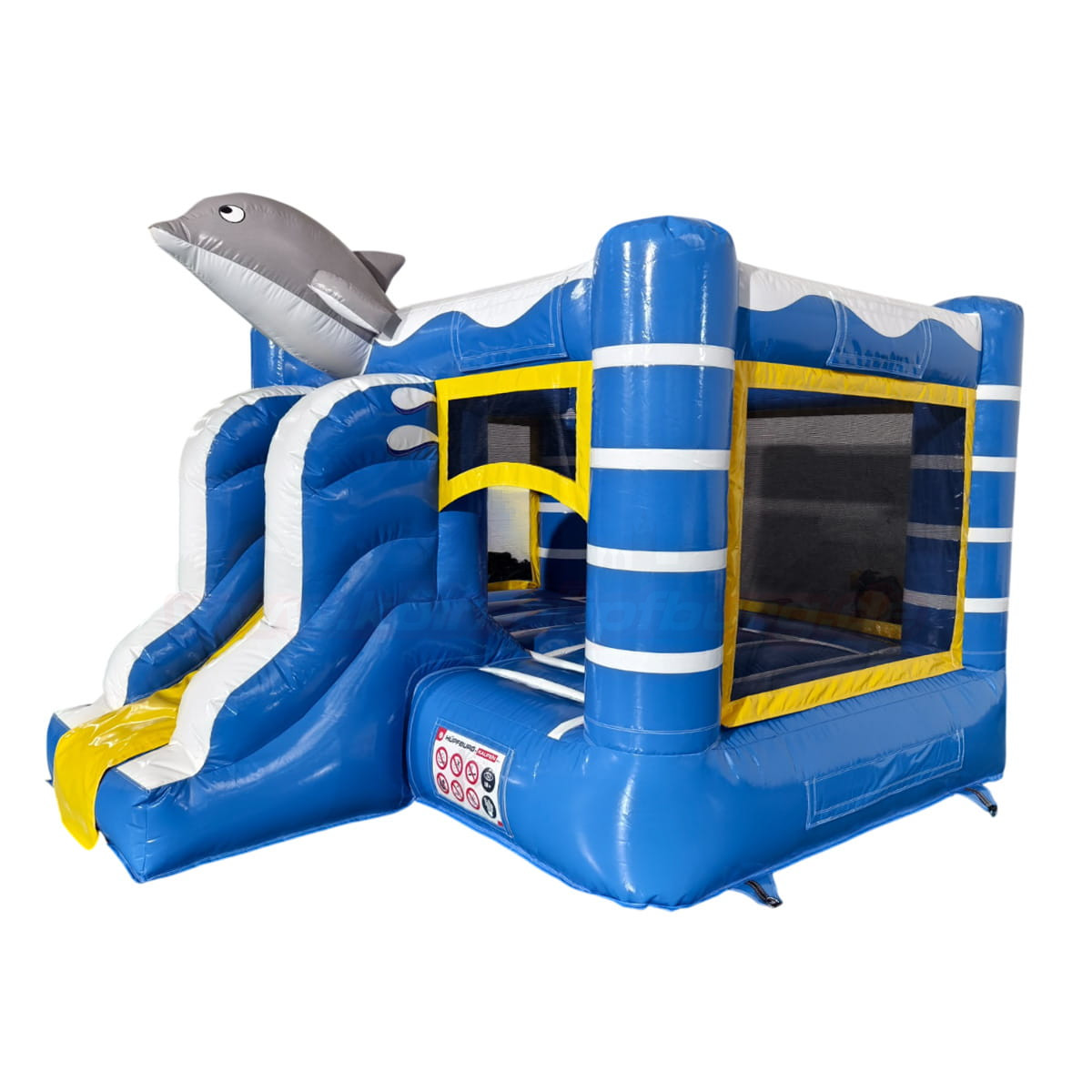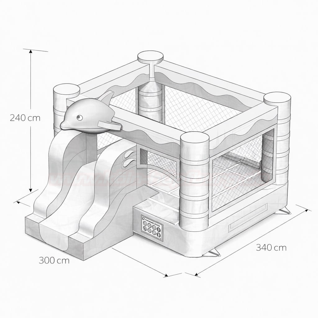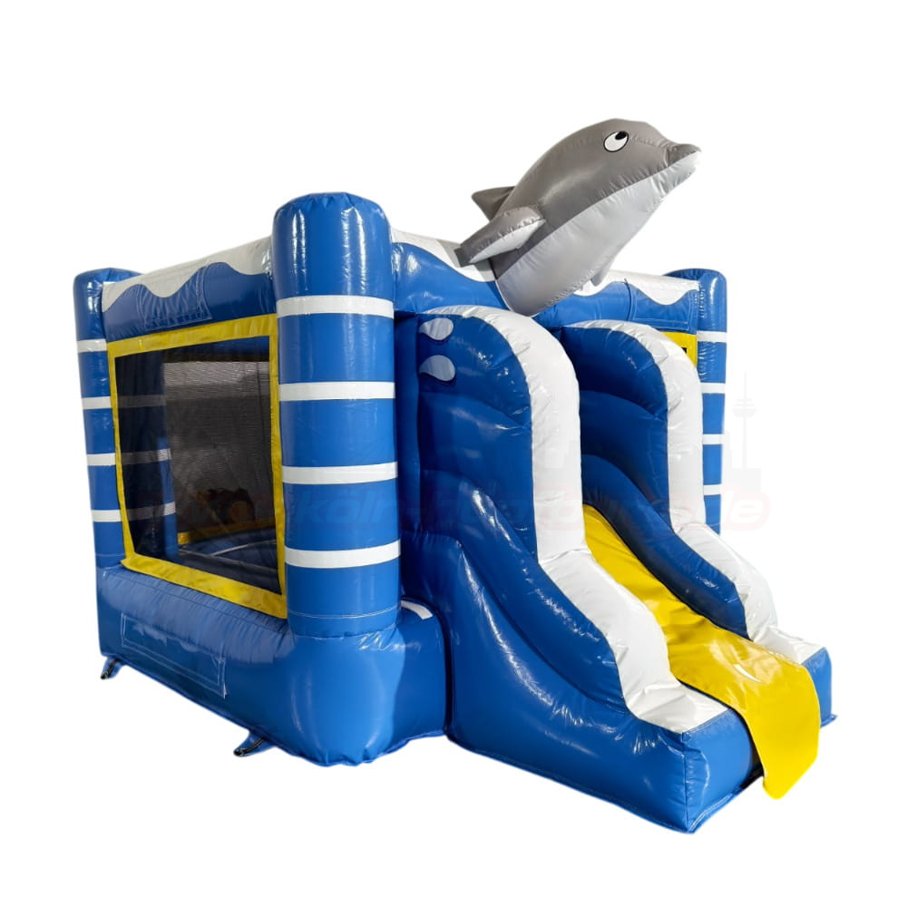 Schon auf den ersten Blick begeistert die Hüpfburg mit ihrem maritimen Design in Blau, Weiß und Gelb. Besonders auffällig ist der große, freundliche Delfin auf dem Dach, der sofort Lust aufs Spielen macht. Die Kombination aus Hüpfbereich, Kletterelementen und kleiner Rutsche macht dieses Modell zu einer echten Mini-Actionwelt für Kinder.