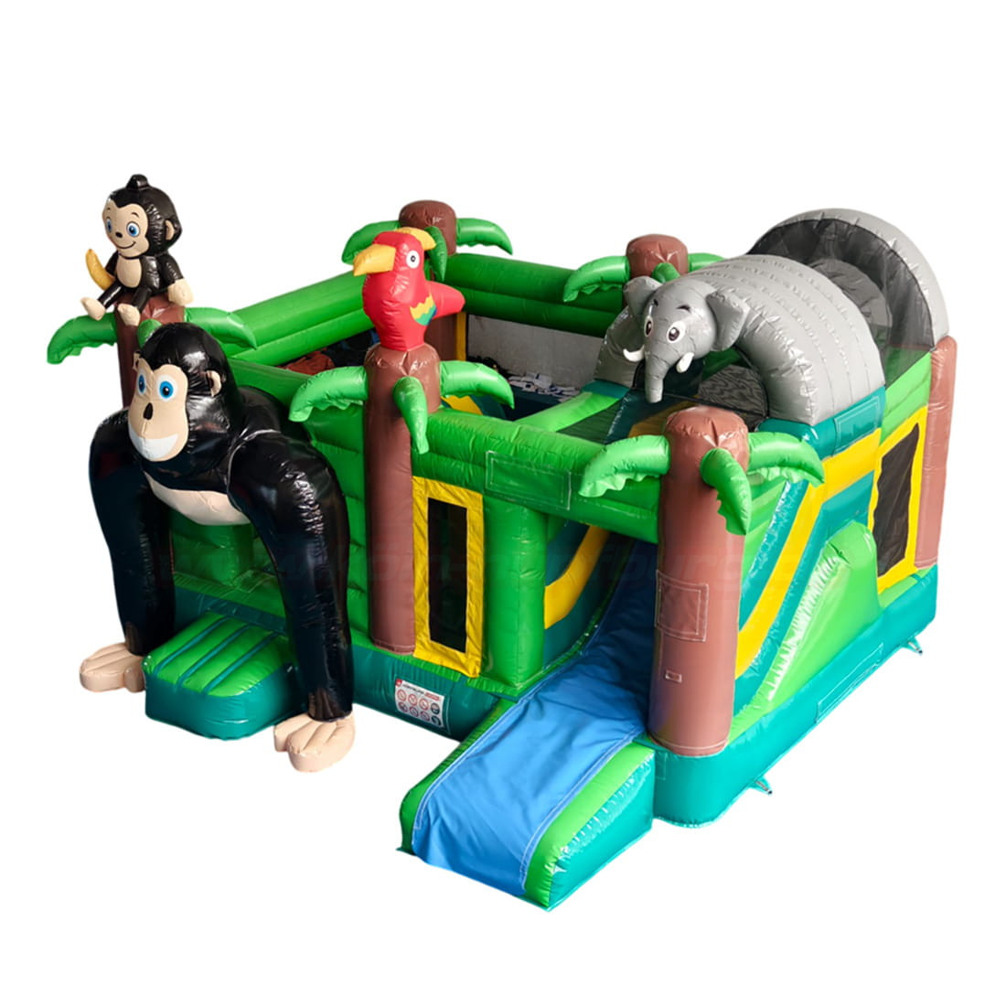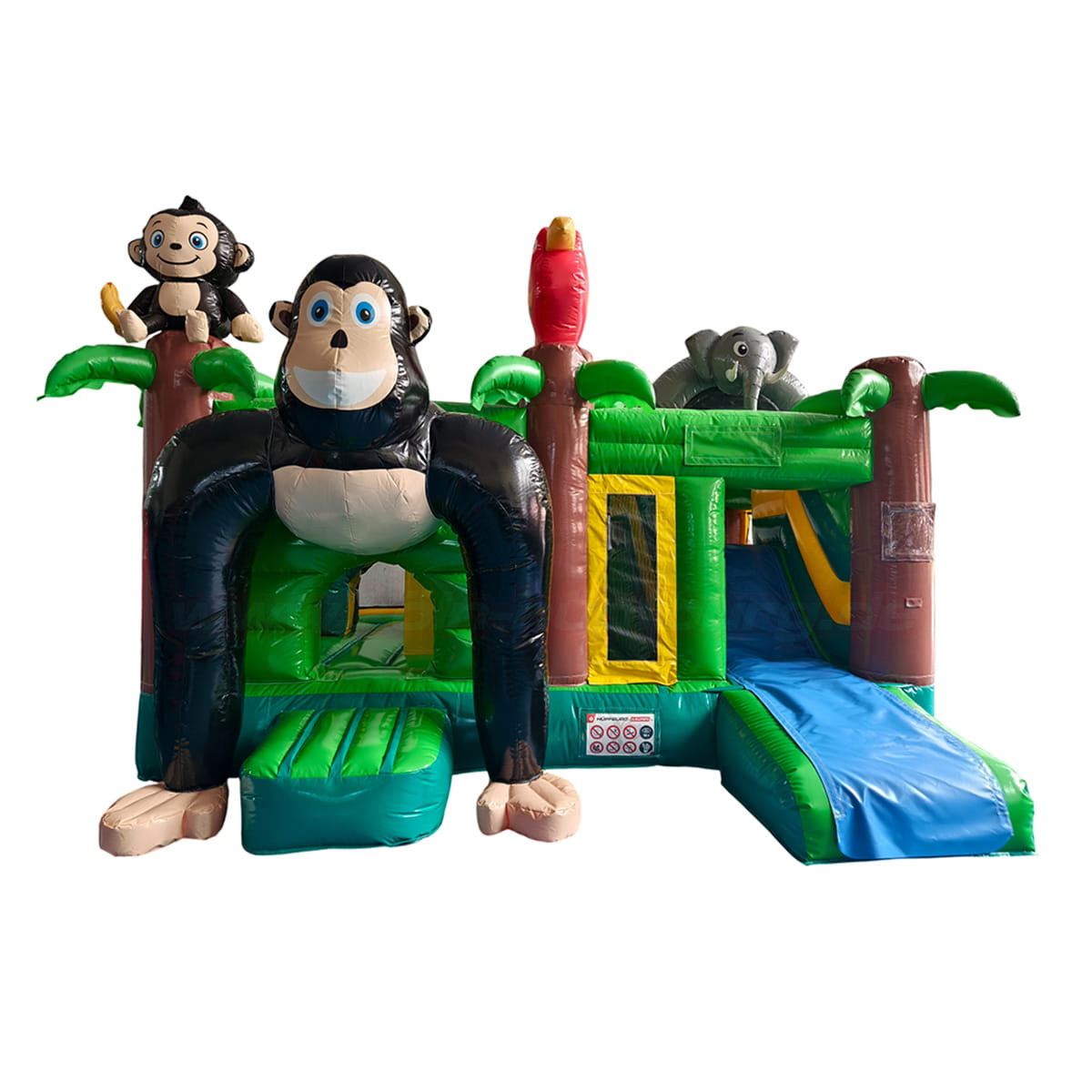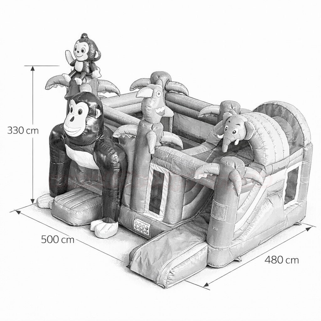 Bereits auf den ersten Blick begeistert die Hüpfburg durch ihr detailreiches Dschungel-Design: Ein großer, freundlicher Gorilla am Eingang lädt die Kinder zum Hineinklettern ein, während ein bunter Papagei und ein Elefant auf dem Dach das Abenteuer perfekt machen. Die grünen Palmen-Elemente und die farbenfrohen Seitenwände schaffen echtes Urlaubs-Feeling – direkt bei Ihrem Event!