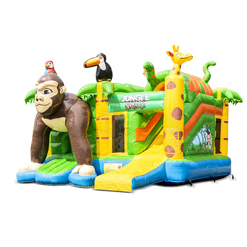 Bunte Safari-Hüpfburg mit Rutsche, Gorilla & Dschungeltieren – ideal für Kindergeburtstage und Events in Köln. Jetzt online anfragen & am Wochenende Spaß pur erleben!