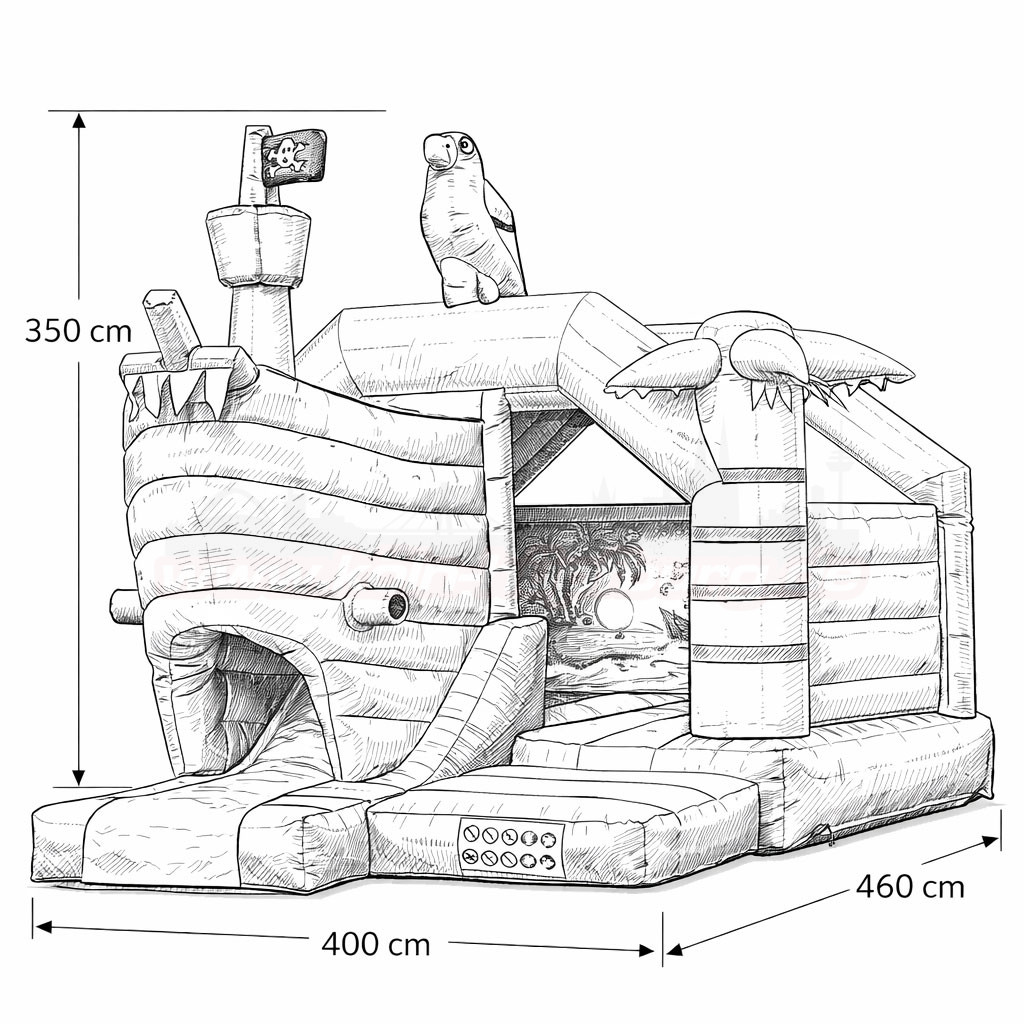 Eine aufblasbare Palme sorgt für echtes Insel-Feeling, während das farbenfrohe Innenmotiv mit Sonnenuntergang und Meer das Piratenabenteuer perfekt abrundet. Die stabile Bauweise und der großzügige Einstiegsbereich bieten ein sicheres und gleichzeitig aufregendes Spielerlebnis.