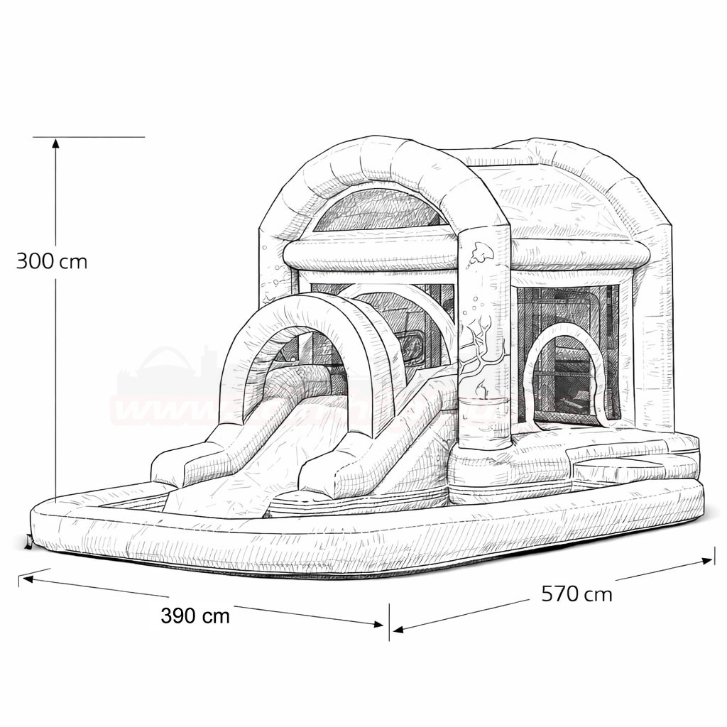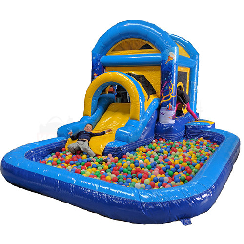 3-in-1 Kombination aus Hüpfburg, Rutsche und Wasserbecken. Im Sommer kann man dieses Modell mit Wasser nutzen.