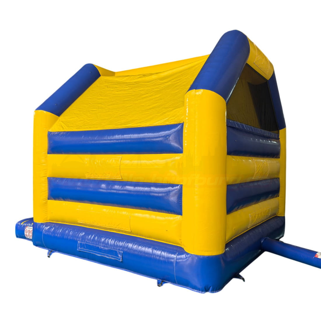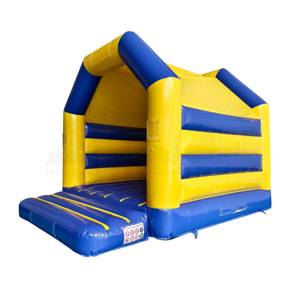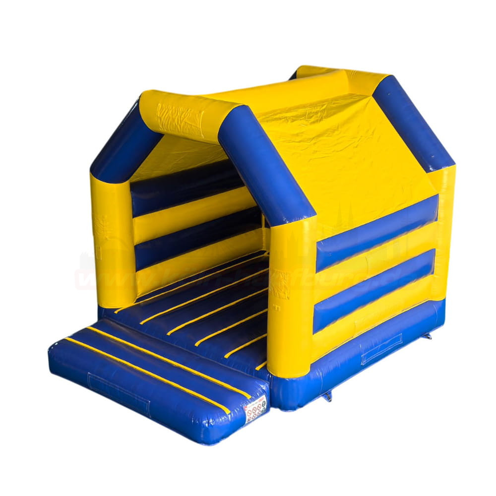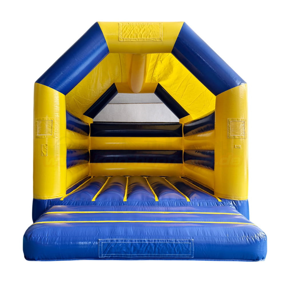 Klassische Hüpfburg in Blau-Gelb für Kindergeburtstage und Events in Köln. Mit sicherem Einstieg, Netzseiten und Überdachung – jetzt einfach online anfragen und vor Ort abholen. Wochenendpauschale verfügbar!