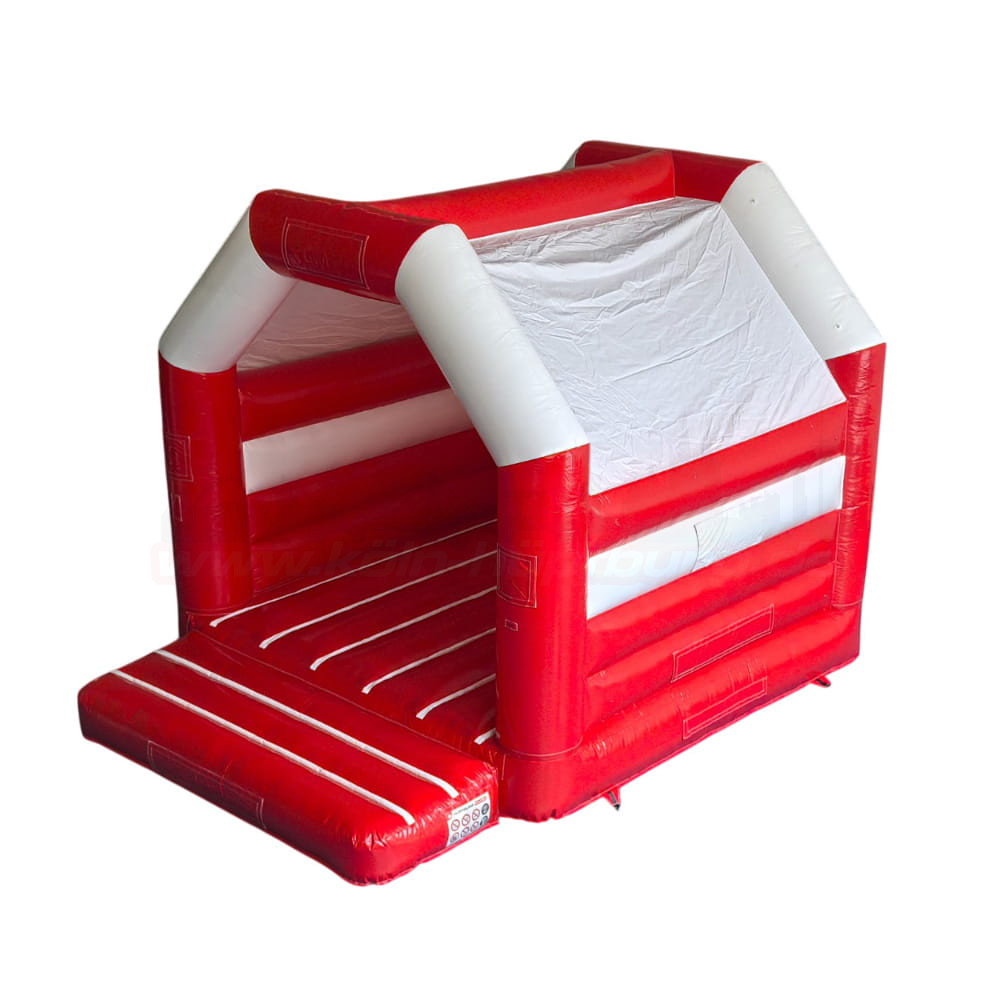 Die Hüpfburg Standard rot-weiß überzeugt durch ihr klassisches, offenes Design mit schützendem Dach und stabilen Seitenwänden. Auf dem Produktbild erkennt man sofort die hochwertige Verarbeitung: Die leuchtend roten Luftkammern bilden einen stabilen Rahmen, während weiße Flächen für einen freundlichen, sauberen Look sorgen.